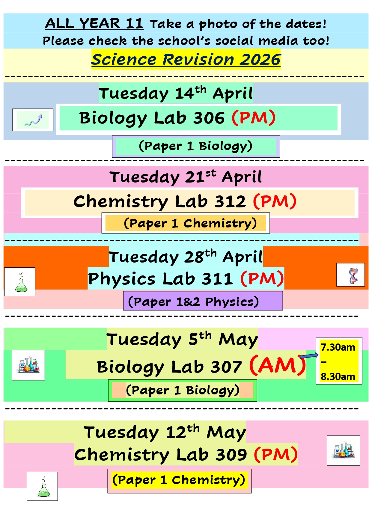 Year 11 make sure that you attend the Science revision sessions which will be a great help preparing for the exams. To see the session timetable for this term – click